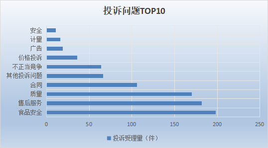赞扬受理量较大的问题次要有:食物平安(198件)、售后办事(182件)、质量(170件)、合同(106件),按赞扬问题类别分类次要有:虚假宣传23件,征询3121件,举报450件,同比下降16.26%?