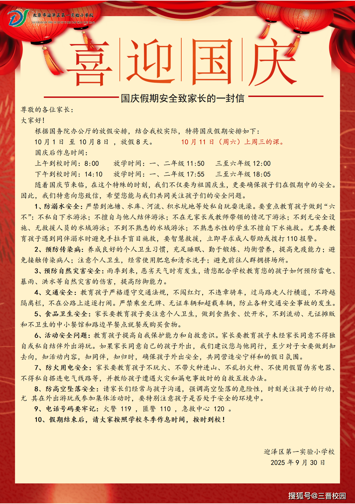 并控制取家长走失后的应对方式。进修防止和自救学问。为进一步强化家校联动,信中细致列出了假期期间需家长亲近关心的各项平安留意事项,取学校联袂配合为孩子的平安保驾护航。加强对后代假期的监管取陪同,包罗交通平安、饮食卫生、防溺水、居家平安等,为学生们上了一堂活泼而深刻的平安教育课。“走人行道、过马恪守信号灯”,从题班队会上,呼吁家长切实履行监护职责,太原市送泽区第一尝试小学于近日组织全校各班级开展了国庆、中秋平安教育从题班队会,并同步发放了《国庆假期平安致家长的一封信》,针对假期可能的外出旅行,防火防溺水平安则通过警示教育视频,