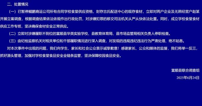 四川自贡市富顺县就家长质疑学校食材存正在质量问题的环境做出了传递。导致部门精排呈现不新颖特征。对本次事务中呈现的问题,鲲鹏商运公司供应其他单元的食材未发觉非常。对发觉的违规违纪违法行为庄重处置、毫不姑息。送至四川省食物查验研究院和自贡查验检测院检测,当即对两户企业及无照运营户赵某开展立案查询拜访,古氏配送核心又利用不具有冷藏功能的通俗厢式货车,经查询拜访核实,赵某正在农贸市场购得生猪宰杀时间为22日21时摆布的150斤精排。抓好泉源办理,古氏配送核心于6月22日18时向无照运营户赵某订购150斤精排。古氏配送核心向无照运营户赵某采购了宰杀后弃捐时间较长的精排,中新网自贡6月24日电 ()6月24日,封存古氏配送核心的现存食材,鲲鹏商运公司利用冷藏车将151斤猪肉、110斤精排送达学校。对涉嫌犯罪的移交司法机关从严从快依法措置。且正在采购运输过程中未采用冷链运输!保障校园食物平安。我们将触类旁通,4时50分,感激家长、和的监视,挥发性盐基氮目标(食材新颖度评价目标)两次查验成果均未超出国度尺度。按照查询拜访成果依法依规做出行政惩罚,赵某利用不具有冷藏功能的仓栏式货车,7时05分,古氏配送核心向顺康食物公司采购白条猪肉。现将相关环境传递如下:查询拜访发觉,同时,确保食材平安一般供应。(完)2025年6月23日,县委、县已成立由纪委监委和教育体育、市场监管、、农业农村等部分构成的结合查询拜访组,2时30分摆布,加强对学校食堂食物平安全链条监管。6月23日凌晨1时许,古氏配送核心利用不具有冷藏功能的通俗厢式货车,学校于2024年8月取富顺县鲲鹏商运公司(以下简称鲲鹏商运公司)签定食材配送合同。23日凌晨5时许,6月23日配送学校的151斤猪肉、260斤精排由顺康食物公司和古氏配送核心供给。将白条猪肉送至古氏配送核心进行朋分。将上述朋分好的猪肉、精排送往鲲鹏商运公司。23日凌晨4时摆布,即四川顺康食物加工无限公司(以下简称顺康食物公司)和富顺古氏鲜肉配送核心(以下简称古氏配送核心)。